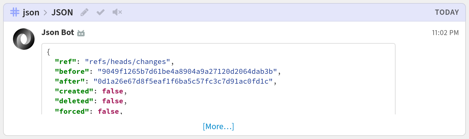 Render JSON payloads nicely in a Zulip code block! This is particularly useful when you want to capture a webhook payload as part of writing an incoming webhook integration.